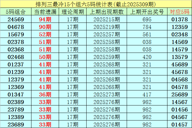 (1)目前排列三5码组六遗漏期数最大的组合为:24569,目前轮空94期;