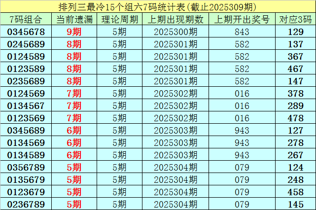 (1)在排列三已开出的7433期奖号中(统计截止第2025309期),目前7码组六遗漏值最大的组合为:0345678,本期遗漏9期;